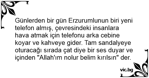 Günlerden bir gün Erzurumlunun biri yeni telefon almış, çevresindeki insanlara hava atmak için telefonu arka cebine koyar ve kahveye gider. Tam sandalyeye oturacağı sırada çat diye bir ses duyar ve içinden "Allah'ım nolur belim kırılsın" der.