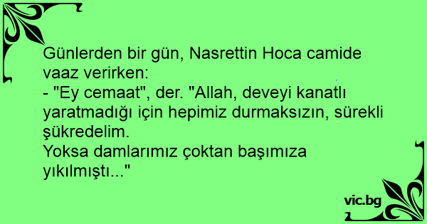 - "Ey cemaat", der. "Allah, deveyi kanatlı yaratmadığı için hepimiz durmaksızın, sürekli şükredelim.