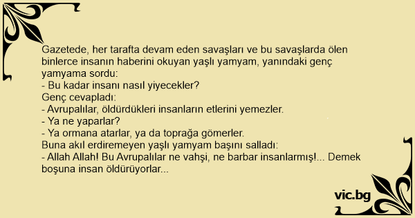 Gazetede, her tarafta devam eden savaşları ve bu savaşlarda ölen binlerce insanın haberini okuyan yaşlı yamyam, yanındaki genç yamyama sordu: