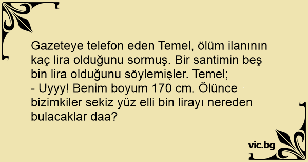 Gazeteye telefon eden Temel, ölüm ilanının kaç lira olduğunu sormuş. Bir santimin beş bin lira olduğunu söylemişler. Temel;