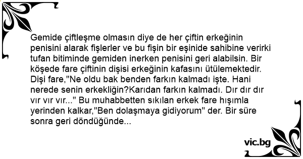 Gemide çiftleşme olmasın diye de her çiftin erkeğinin penisini alarak fişlerler ve bu fişin bir eşinide sahibine verirki tufan bitiminde gemiden inerken penisini geri alabilsin. Bir köşede fare çiftinin dişisi erkeğinin kafasını ütülemektedir. Dişi fare,"Ne oldu bak benden farkın kalmadı işte. Hani nerede senin erkekliğin?Karıdan farkın kalmadı. Dır dır dır vır vır vır..." Bu muhabbetten sıkılan erkek fare hışımla yerinden kalkar,"Ben dolaşmaya gidiyorum" der. Bir süre sonra geri döndüğünde dişi fare kaldığı yerden devam eder. "Erkek müsfettesi seni ne oldu?dolaştın dolaştın havanı aldın dimi?İbne oldun sen artık. Dır dır dır vır vır vır..." İyice sinirlenen erkek fare sinsi sinsi gülerek dişinin kulağına eğilerek. "Bana bak kadın demin eşeğin fişini çaldım. Gemiden indiğimizde gününü göreceksin."