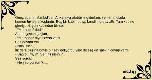 Genç adam, İstanbul'dan Ankara'ya otobüsle giderken, verilen molada hemen tuvalete koşturdu. Boş bir kabin bulup kendini oraya attı. Tam kabine girmişti ki, yan kabinden bir ses,