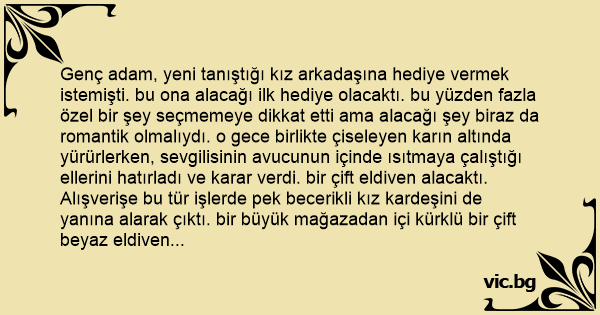 Genç adam, yeni tanıştığı kız arkadaşına hediye vermek istemişti. bu ona alacağı ilk hediye olacaktı. bu yüzden fazla özel bir şey seçmemeye dikkat etti ama alacağı şey biraz da romantik olmalıydı. o gece birlikte çiseleyen karın altında yürürlerken, sevgilisinin avucunun içinde ısıtmaya çalıştığı ellerini hatırladı ve karar verdi. bir çift eldiven alacaktı.
