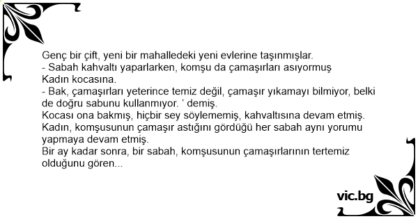 Bir ay kadar sonra, bir sabah, komşusunun çamaşırlarının tertemiz olduğunu gören kadın çok şaşırmıs, bak demiş kocasına.