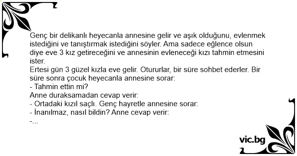 Genç bir delikanlı heyecanla annesine gelir ve aşık olduğunu, evlenmek istediğini ve tanıştırmak istediğini söyler. Ama sadece eğlence olsun diye eve 3 kız getireceğini ve annesinin evleneceği kızı tahmin etmesini ister.