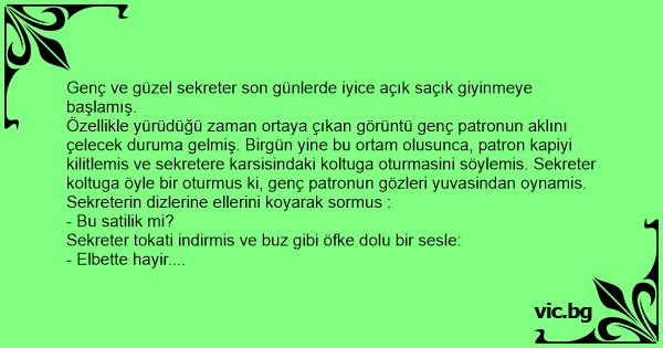 Özellikle yürüdüğü zaman ortaya çıkan görüntü genç patronun aklını çelecek duruma gelmiş. Birgün yine bu ortam olusunca, patron kapiyi kilitlemis ve sekretere karsisindaki koltuga oturmasini söylemis. Sekreter koltuga öyle bir oturmus ki, genç patronun gözleri yuvasindan oynamis. Sekreterin dizlerine ellerini koyarak sormus :