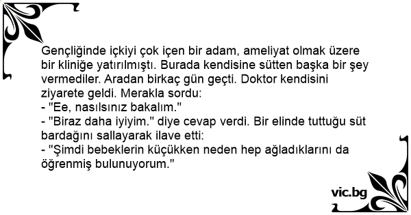 Gençliğinde içkiyi çok içen bir adam, ameliyat olmak üzere bir kliniğe yatırılmıştı. Burada kendisine sütten başka bir şey vermediler. Aradan birkaç gün geçti. Doktor kendisini ziyarete geldi. Merakla sordu: