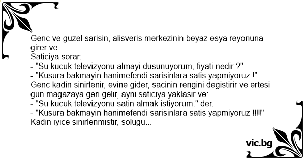 Genc kadin sinirlenir, evine gider, sacinin rengini degistirir ve ertesi gun magazaya geri gelir, ayni saticiya yaklasir ve: