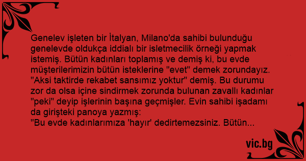 Genelev işleten bir İtalyan, Milano'da sahibi bulunduğu genelevde oldukça iddialı bir isletmecilik örneği yapmak istemiş. Bütün kadınları toplamış ve demiş ki, bu evde müşterilerimizin bütün isteklerine "evet" demek zorundayız. "Aksi taktirde rekabet sansımız yoktur" demiş. Bu durumu zor da olsa içine sindirmek zorunda bulunan zavallı kadınlar "peki" deyip işlerinin başına geçmişler. Evin sahibi işadamı da girişteki panoya yazmış: