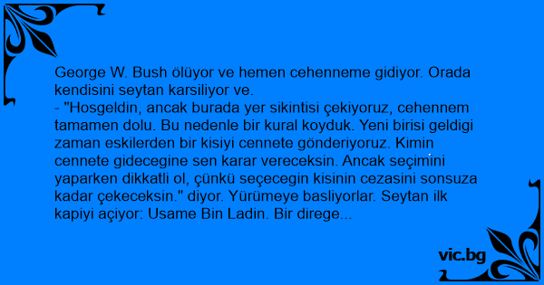 George W. Bush ölüyor ve hemen cehenneme gidiyor. Orada kendisini seytan karsiliyor ve.