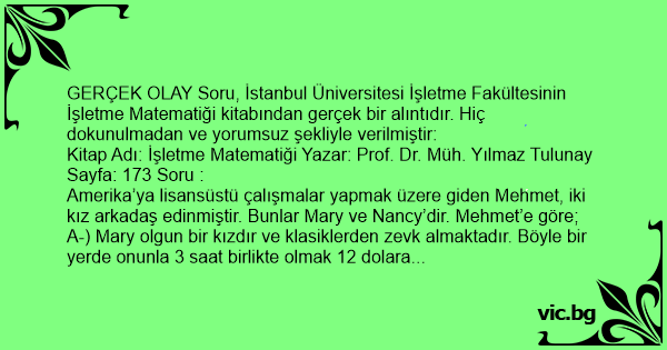 GERÇEK OLAY Soru, İstanbul Üniversitesi İşletme Fakültesinin İşletme Matematiği kitabından gerçek bir alıntıdır. Hiç dokunulmadan ve yorumsuz şekliyle verilmiştir: