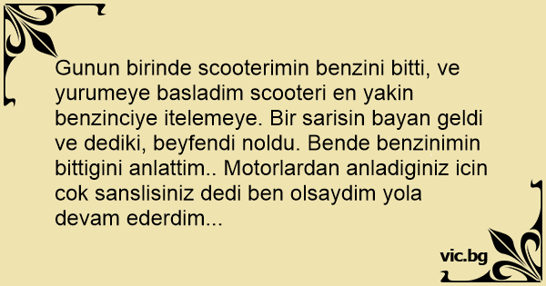 Gunun birinde scooterimin benzini bitti, ve yurumeye basladim scooteri en yakin benzinciye itelemeye. Bir sarisin bayan geldi ve dediki, beyfendi noldu. Bende benzinimin bittigini anlattim.. Motorlardan anladiginiz icin сок sanslisiniz dedi ben olsaydim yola devam ederdim...