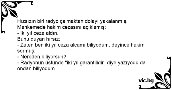 Hızsızın biri radyo çalmaktan dolayı yakalanmış. Mahkemede hakim cezasını açıklamış: