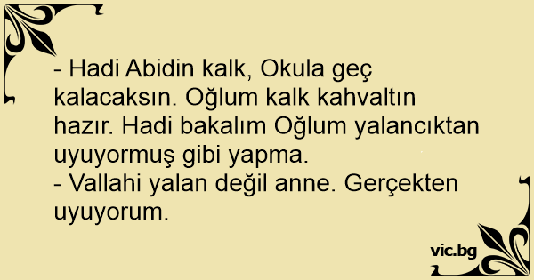 - Hadi Abidin kalk, Okula geç kalacaksın. Oğlum kalk kahvaltın hazır. Hadi bakalım Oğlum yalancıktan uyuyormuş gibi yapma.