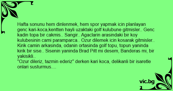 Hafta sonunu hem dinlenmek, hem spor yapmak icin planlayan genc kari-koca,kentten hayli uzaktaki golf kulubune gitmisler.. Genc kadin тора bir cakmis.. Sangir.. Agaclarin arasindaki bir koy kulubesinin cami paramparca.. Ozur dilemek icin kosarak gitmisler..
