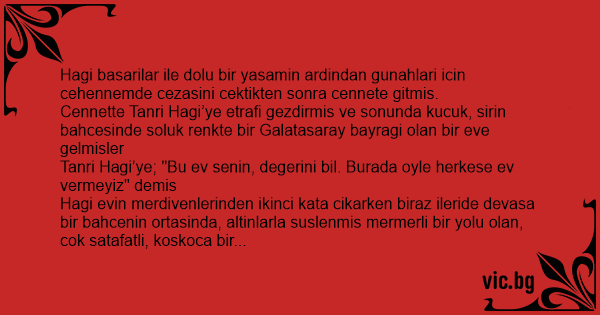 Cennette Tanri Hagi’ye etrafi gezdirmis ve sonunda kucuk, sirin bahcesinde soluk renkte bir Galatasaray bayragi olan bir eve gelmisler