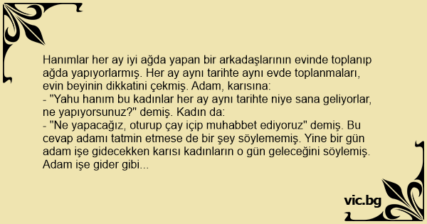 - "Ne yapacağız, oturup çay içip muhabbet ediyoruz" demiş. Bu cevap adamı tatmin etmese de bir şey söylememiş. Yine bir gün adam işe gidecekken karısı kadınların o gün geleceğini söylemiş.