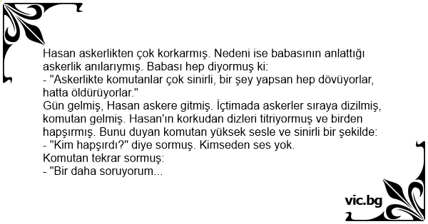 Gün gelmiş, Hasan askere gitmiş. İçtimada askerler sıraya dizilmiş, komutan gelmiş. Hasan'ın korkudan dizleri titriyormuş ve birden hapşırmış. Bunu duyan komutan yüksek sesle ve sinirli bir şekilde: