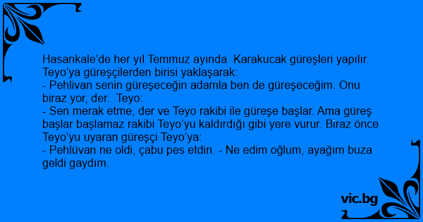- Pehlivan senin güreşeceğin adamla ben de güreşeceğim. Onu biraz yor, der. Teyo: