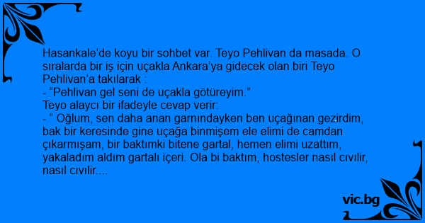 Hasankale’de koyu bir sohbet var. Teyo Pehlivan da masada. O sıralarda bir iş için uçakla Ankara’ya gidecek olan biri Teyo Pehlivan’a takılarak :