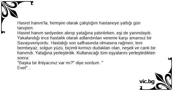Ama bu onun sanki tabiatına aykırı gibi bir insan o. "kocası ise her gün Hasret hanım'ı ziyarete geliyordu. Önceleri, Hasret hanım yatağında kitabını okurken veya televizyon seyrederken, o da yatağının ayak ucunda oturuyordu. Hasret hanım, daha sonraki günlerde, uzun saatler uyurken;