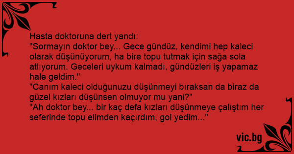 "Sormayın doktor bey... Gece gündüz, kendimi hep kaleci olarak düşünüyorum, ha bire topu tutmak için sağa sola atlıyorum. Geceleri uykum kalmadı, gündüzleri iş yapamaz hale geldim."