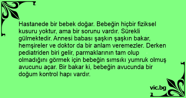 Hastanede bir bebek doğar. Bebeğin hiçbir fiziksel kusuru yoktur, ama bir sorunu vardır. Sürekli gülmektedir. Annesi babası şaşkın şaşkın bakar, hemşireler ve doktor da bir anlam veremezler. Derken pediatriden biri gelir, parmaklarının tam olup olmadığını görmek için bebeğin sımsıkı yumruk olmuş avucunu açar. Bir bakar ki, bebeğin avucunda bir doğum kontrol hapı vardır.