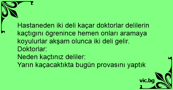 Hastaneden iki deli kaçar doktorlar delilerin kaçtıgını ögrenince hemen onları aramaya koyulurlar akşam olunca iki deli gelir.