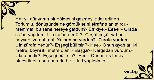 Her yıl dünyanın bir bölgesini gezmeyi adet edinen Tortumlu, dönüşünde de gördüklerini etrafına anlatırdı.- Memmet, bu sene nereye getdün?- Efrikiye.- Eeee?- Orada safari yapduh.- Ula safari nedür?- Çeşüt çeşüt yaban hayvani vurduh da!- Ya sen ne vurdun?- Zürafa vurdum.- Ula zürafa nedür?- Eşşegi bülirsin?- Hee.- Onun ayahlari iki metre, boyni iki metre olani.- Başga?- Kergedan vurdum.- Ula o nedir?- Eşşegi bülirsin?- Hee.- Ondan üş teneyi birleşdirirsin burnuna da bir tikinti yapirsin, o.- Başga?- Piton vurdum.- Piton ne ki?- Eşşegi bülirsin?- Hee.- Şeyini de bülirsin?- Helbe.- Onun dört metre olani. Ama eşşeg yoh!