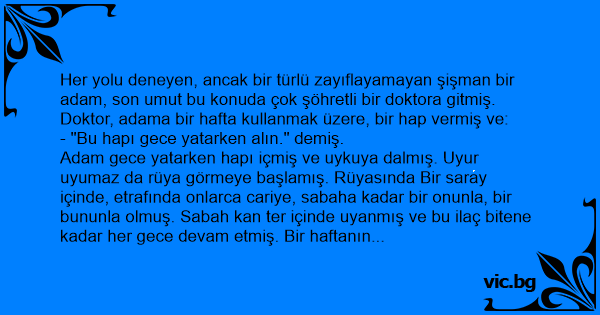 Adam gece yatarken hapı içmiş ve uykuya dalmış. Uyur uyumaz da rüya görmeye başlamış. Rüyasında Bir saray içinde, etrafında onlarca cariye, sabaha kadar bir onunla, bir bununla olmuş. Sabah kan ter içinde uyanmış ve bu ilaç bitene kadar her gece devam etmiş. Bir haftanın sonunda, adama bütün fazla kilolarından kurtulmuş. Günler sonra yolda, kendisi gibi zayıflayamayan bir arkadaşı ile karşılaşmışlar. Arkadaşı nasıl bu kadar hızla zayıfladığını sorduğunda, doktorun ismini vermiş. Arkadaşı da aynı doktora giderek ilaç almış ve gece yatarken içmeye başlamış. İlk gece, adam rüyasında bir sarayda, etrafında onlarca zenci, adamı bir o yatırıyor, bir bu. Adamı mahvetmişler. Bu durum ilaç bitene kadar devam etmiş. Adam sonunda dayanamamış ve arkadaşına telefon etmiş: