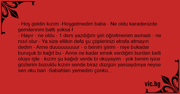 - Hayır - ne oldu - 1 ders yazdığım şiiri öğretmenim asmadı - ne nısıl olur - Ya size ellibin defa şu çöplerinizi etrafa atmayın dedim - Anne duuuuuuuuur - o benim şiirim - niye bukadar buruşuk bi kağıt bu - Anne ne kadar emek verdiğim burdan belli oluyo işte - kızım şu kağıdı verde bi okuyayim - yok benim iyice gözlerim bozuldu kızım sende biraz düzgün yassaydınya neyse sen oku bari -Sabahları yemedim çünkü seni düşündün öğlenleri yemedim çünkü seni düşündüm akşamlar yatmadım çünkü açıktım canım arkadaaşım - baba = bana bu şiir çok tanıdık geliyo ama çıkaramadım Anne = bana da geliyo - şey baba ben bu şiiri senin anneme yazdığım mektuplardan baktı 1 derste hatırlamak zor oldu ama olsun baba yarım okula gelçeksin dimi - Baba = şimdi aklıma geldi benim yarın önemli bi toplantım var hem öğretmede haklı her öğrencinin şiirini asamaz - Ya baba