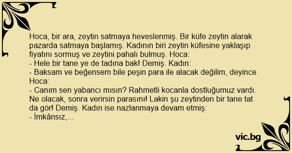 - Canım sen yabancı mısın? Rahmetli kocanla dostluğumuz vardı. Ne olacak, sonra verirsin parasını! Lakin şu zeytinden bir tane tat da gör! Demiş. Kadın ise nazlanmaya devam etmiş: