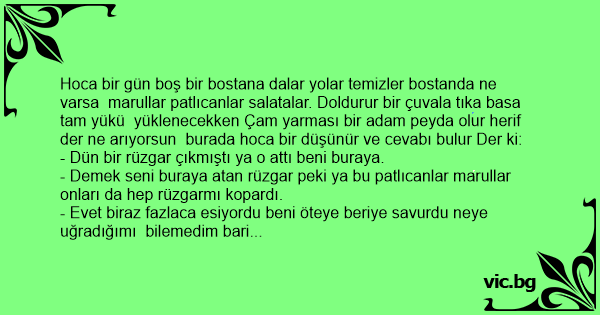 Hoca bir gün boş bir bostana dalar yolar temizler bostanda ne varsa marullar patlıcanlar salatalar. Doldurur bir çuvala tıka basa tam yükü yüklenecekken Çam yarması bir adam peyda olur herif der ne arıyorsun burada hoca bir düşünür ve cevabı bulur Der ki: