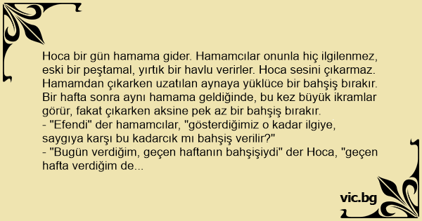 Hoca bir gün hamama gider. Hamamcılar onunla hiç ilgilenmez, eski bir peştamal, yırtık bir havlu verirler. Hoca sesini çıkarmaz. Hamamdan çıkarken uzatılan aynaya yüklüce bir bahşiş bırakır.
