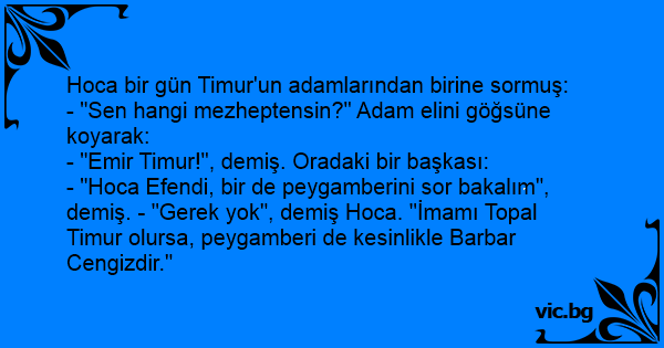 - "Hoca Efendi, bir de peygamberini sor bakalım", demiş. - "Gerek yok", demiş Hoca. "İmamı Topal Timur olursa, peygamberi de kesinlikle Barbar Cengizdir."