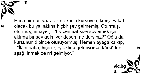 Hoca bir gün vaaz vermek için kürsüye çıkmış. Fakat olacak bu ya, aklına hiçbir şey gelmemiş. Oturmuş, oturmuş, nihayet, - "Ey cemaat size söylemek için aklıma bir şey gelmiyor desem ne dersiniz?" Oğlu da kürsünün dibinde oturuyormuş. Hemen ayağa kalkıp, - "İlâhi baba, hiçbir şey aklına gelmiyorsa, kürsüden aşağı inmek de mi gelmiyor."