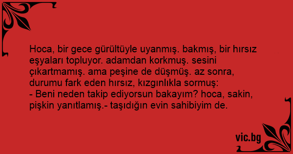 - Beni neden takip ediyorsun bakayım? hoca, sakin, pişkin yanıtlamış.- taşıdığın evin sahibiyim de.