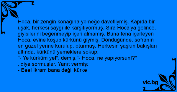 Hoca, bir zengin konağına yemeğe davetliymiş. Kapıda bir uşak, herkesi saygı ile karşılıyormuş. Sıra Hoca'ya gelince, giyisilerini beğenmeyip içeri almamış. Buna fena içerleyen Hoca, evine koşup kürkünü giymiş. Döndüğünde, sofranın en güzel yerine kurulup, oturmuş. Herkesin şaşkın bakışları altında, kürkünü yemeklere sokup: