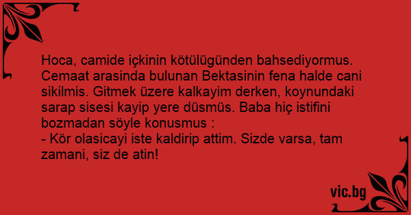 Hoca, camide içkinin kötülügünden bahsediyormus. Cemaat arasinda bulunan Bektasinin fena halde cani sikilmis. Gitmek üzere kalkayim derken, koynundaki sarap sisesi kayip yere düsmüs. Baba hiç istifini bozmadan söyle konusmus :