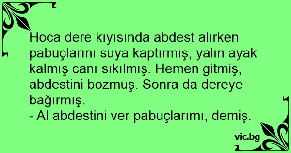 Hoca dere kıyısında abdest alırken pabuçlarını suya kaptırmış, yalın ayak kalmış canı sıkılmış. Hemen gitmiş, abdestini bozmuş. Sonra da dereye bağırmış.