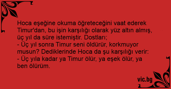 Hoca eşeğine okuma öğreteceğini vaat ederek Timur'dan, bu işin karşılığı olarak yüz altın almış, üç yıl da süre istemiştir. Dostları;