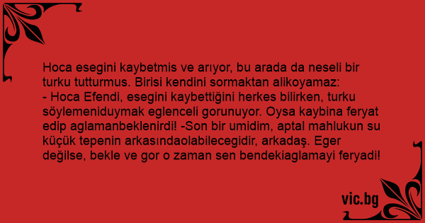 - Hoca Efendi, esegini kaybettiğini herkes bilirken, turku söylemeniduymak eglenceli gorunuyor. Oysa kaybina feryat edip aglamanbeklenirdi! -Son bir umidim, aptal mahlukun su küçük tepenin arkasındaolabilecegidir, arkadaş. Eger değilse, bekle ve gor o zaman sen bendekiaglamayi feryadi!