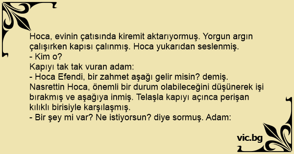 Hoca, evinin çatısında kiremit aktarıyormuş. Yorgun argın çalışırken kapısı çalınmış. Hoca yukarıdan seslenmiş.