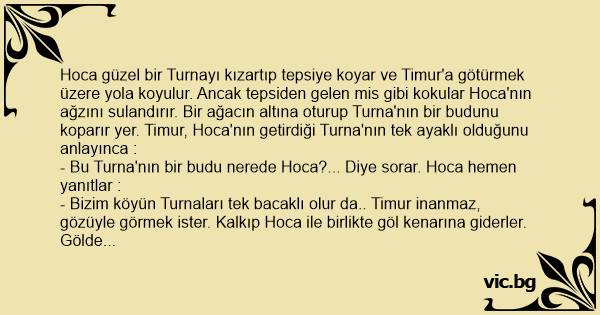 - Bizim köyün Turnaları tek bacaklı olur da.. Timur inanmaz, gözüyle görmek ister. Kalkıp Hoca ile birlikte göl kenarına giderler. Gölde Turnalar tek ayakları üzerinde durduklarından Hoca keyifli keyifli söylenir :