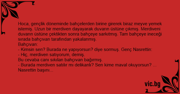 Hoca, gençlik döneminde bahçelerden birine girerek biraz meyve yemek istemiş. Uzun bir merdiven dayayarak duvarın üstüne çıkmış. Merdiveni duvarın üstüne çektikten sonra bahçeye sarkıtmış. Tam bahçeye ineceği sırada bahçıvan tarafından yakalanmış.