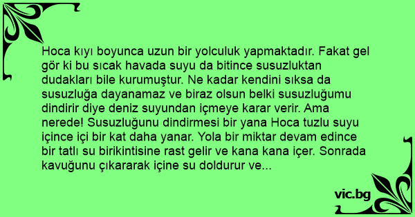 Hoca kıyı boyunca uzun bir yolculuk yapmaktadır. Fakat gel gör ki bu sıcak havada suyu da bitince susuzluktan dudakları bile kurumuştur. Ne kadar kendini sıksa da susuzluğa dayanamaz ve biraz olsun belki susuzluğumu dindirir diye deniz suyundan içmeye karar verir. Ama nerede! Susuzluğunu dindirmesi bir yana Hoca tuzlu suyu içince içi bir kat daha yanar. Yola bir miktar devam edince bir tatlı su birikintisine rast gelir ve kana kana içer. Sonrada kavuğunu çıkararak içine su doldurur ve kendinden emin adımlarla denizin kıyısına gelir ve kavuğundakini denize doğru savurarak: