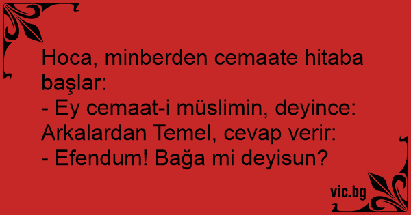 - Ey cemaat-i müslimin, deyince: Arkalardan Temel, cevap verir: