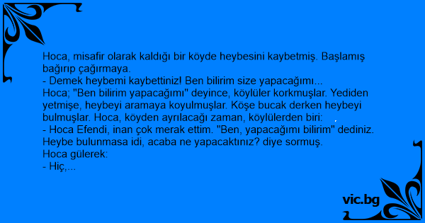 Hoca, misafir olarak kaldığı bir köyde heybesini kaybetmiş. Başlamış bağırıp çağırmaya.