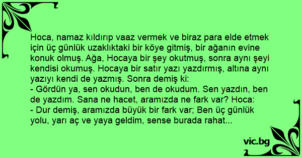 - Gördün ya, sen okudun, ben de okudum. Sen yazdın, ben de yazdım. Sana ne hacet, aramızda ne fark var? Hoca: