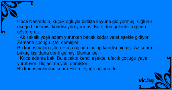 Hoca Nasreddin, küçük oğluyla birlikte köyüne gidiyormuş. Oğlunu eşeğe bindirmiş, kendisi yürüyormuş. Karşıdan gelenler, oğlunu göstererek: